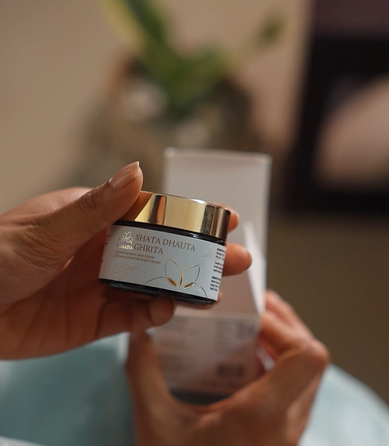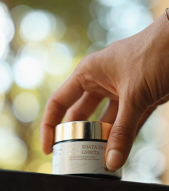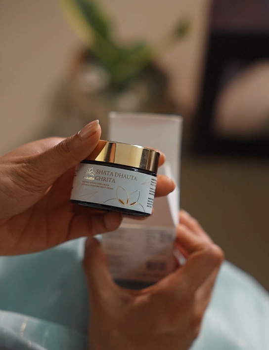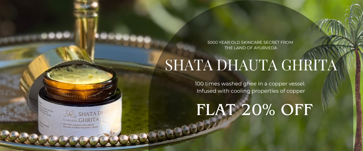 A classical Ayurveda skin formulation, ghee is washed 100 times in a copper vessel to possess the detoxfying & cooling properties of copper metal, and transforming ghee fat into nano fat particles that seep to the deepest skin layers nourishing and healing skin cells from within.